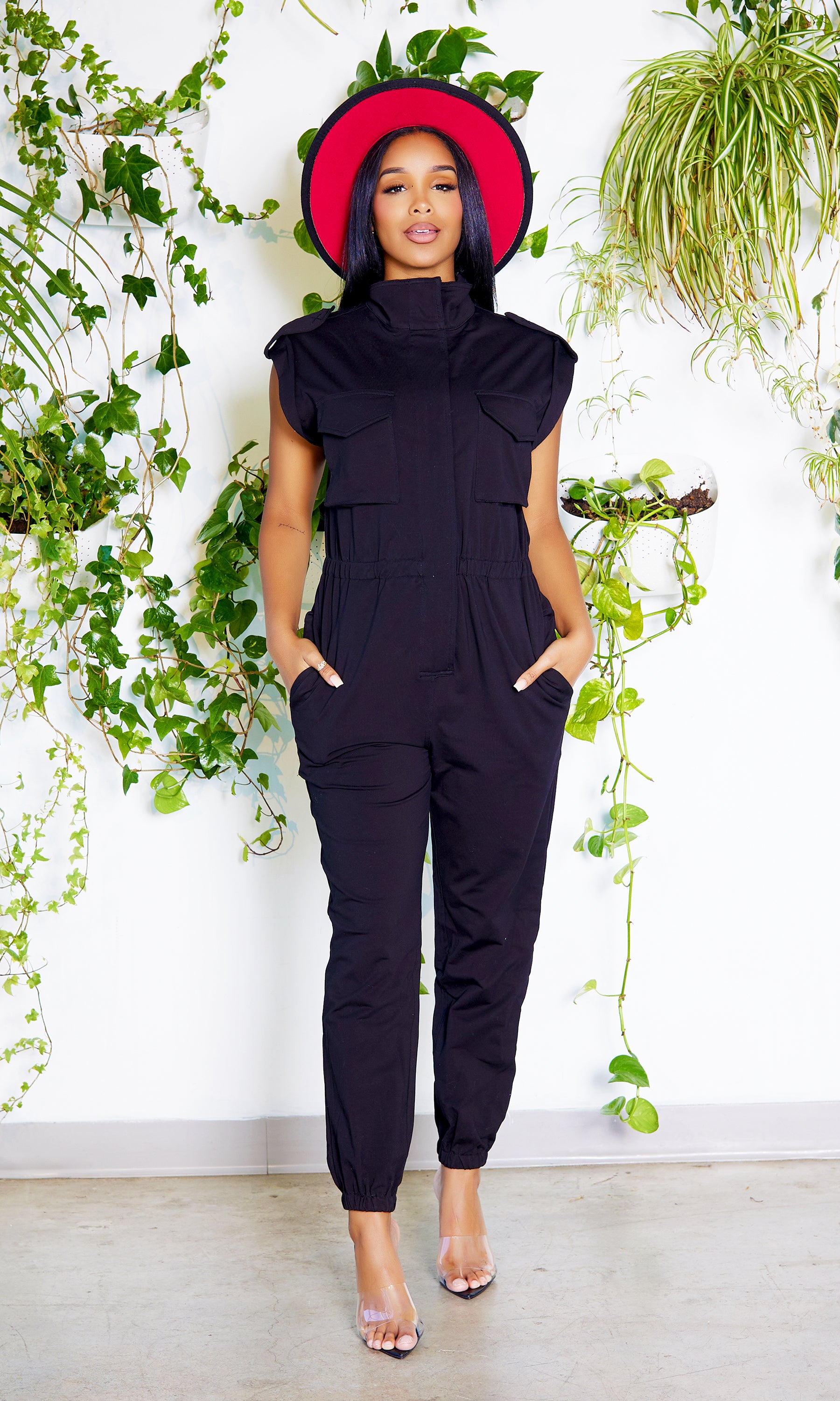 Are you ready to slay all day? Well, it's time to grab the perfect jumpsuit! Pocket detail high neck sleeveless jumpsuit in Cotton stretch fabric. This style features folded sleeves with shoulder epaulettes, chest flap pockets, cinched elasticated waist, ankle length pants with elasticated cuff, and concealed front zipper closure.