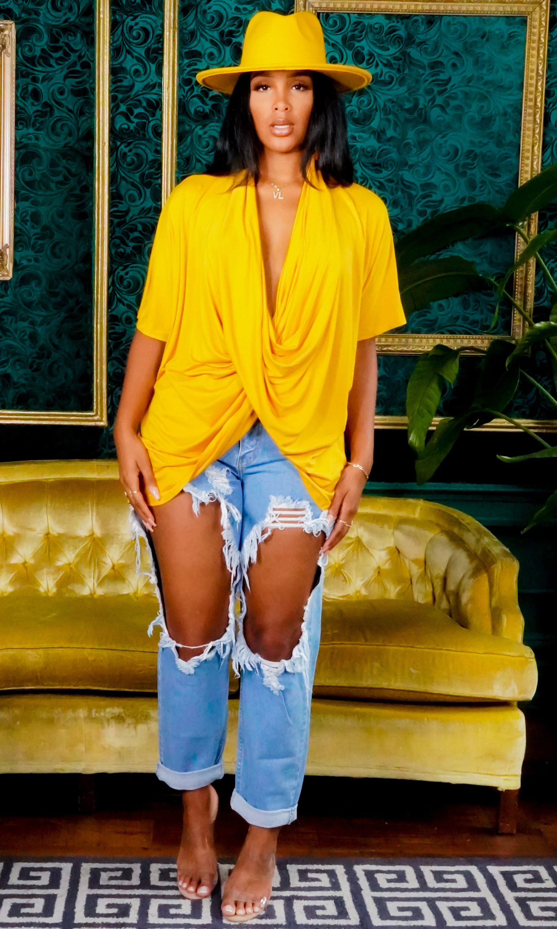 Update your wardrobe with a fun, comfortable look. Featuring a short sleeve casual blouse. Pair it with our Still trending mustard Fedora & cutting up denim.