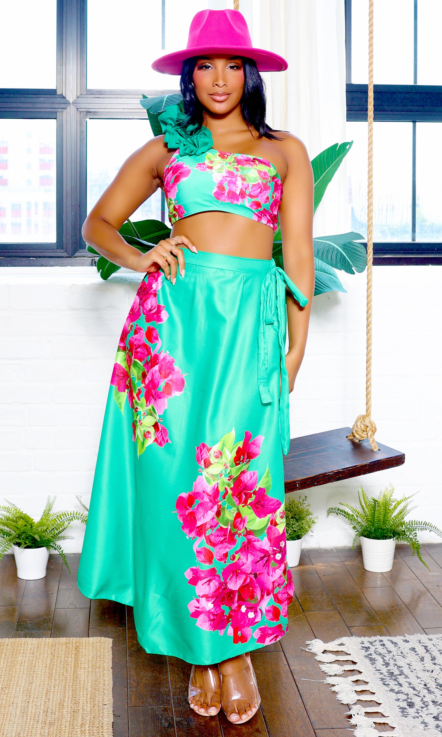 Elizabeth | Floral One Shoulder Bikini & Coverup Set - Green Pink
