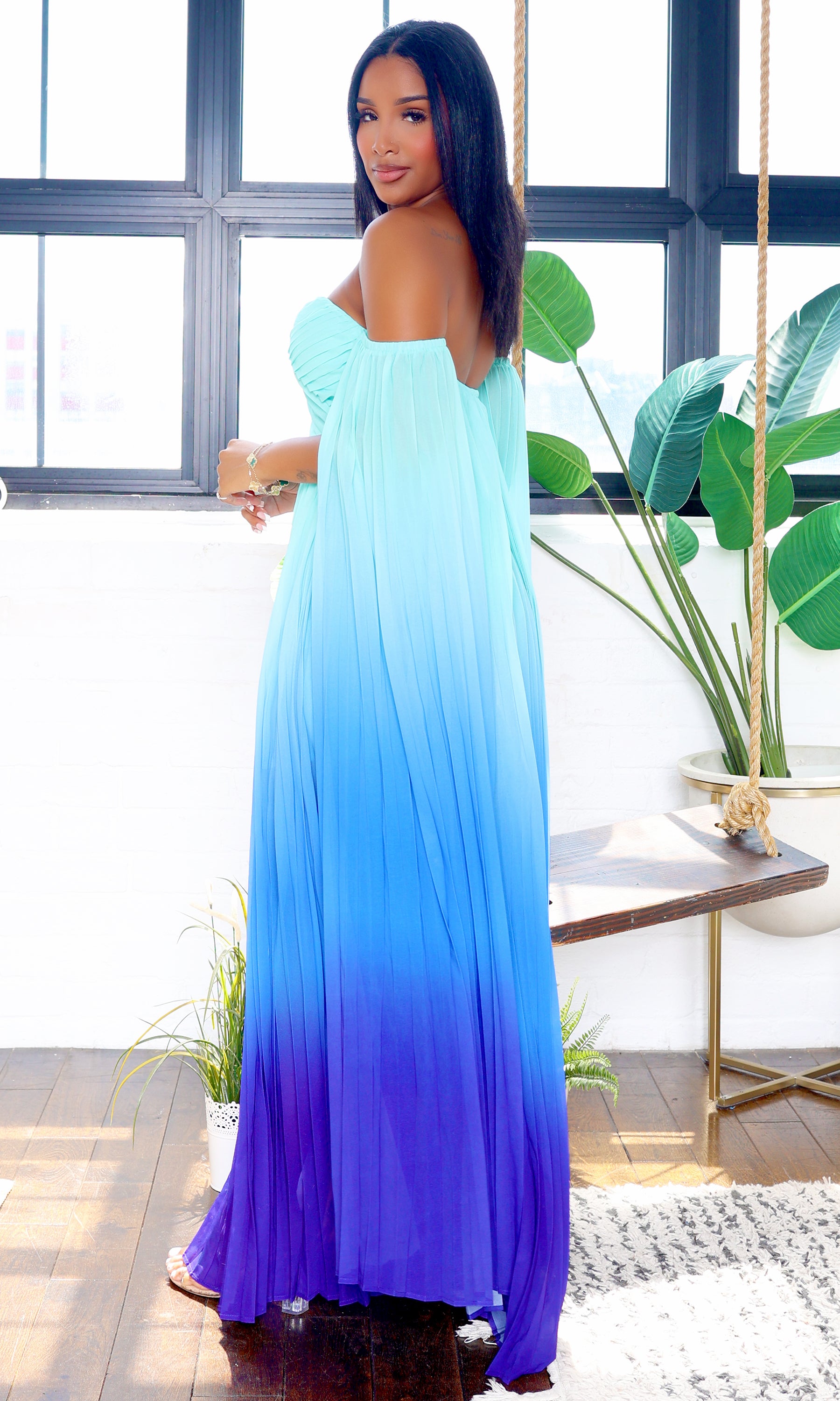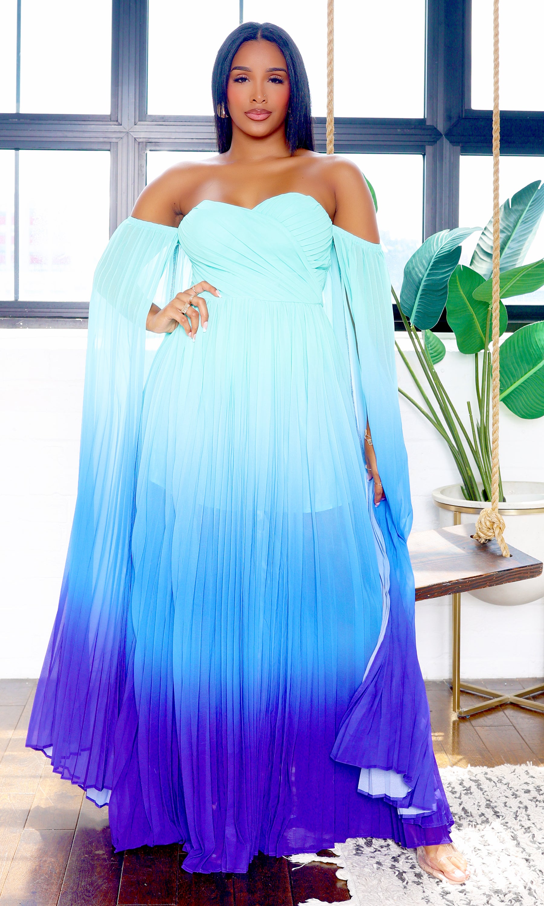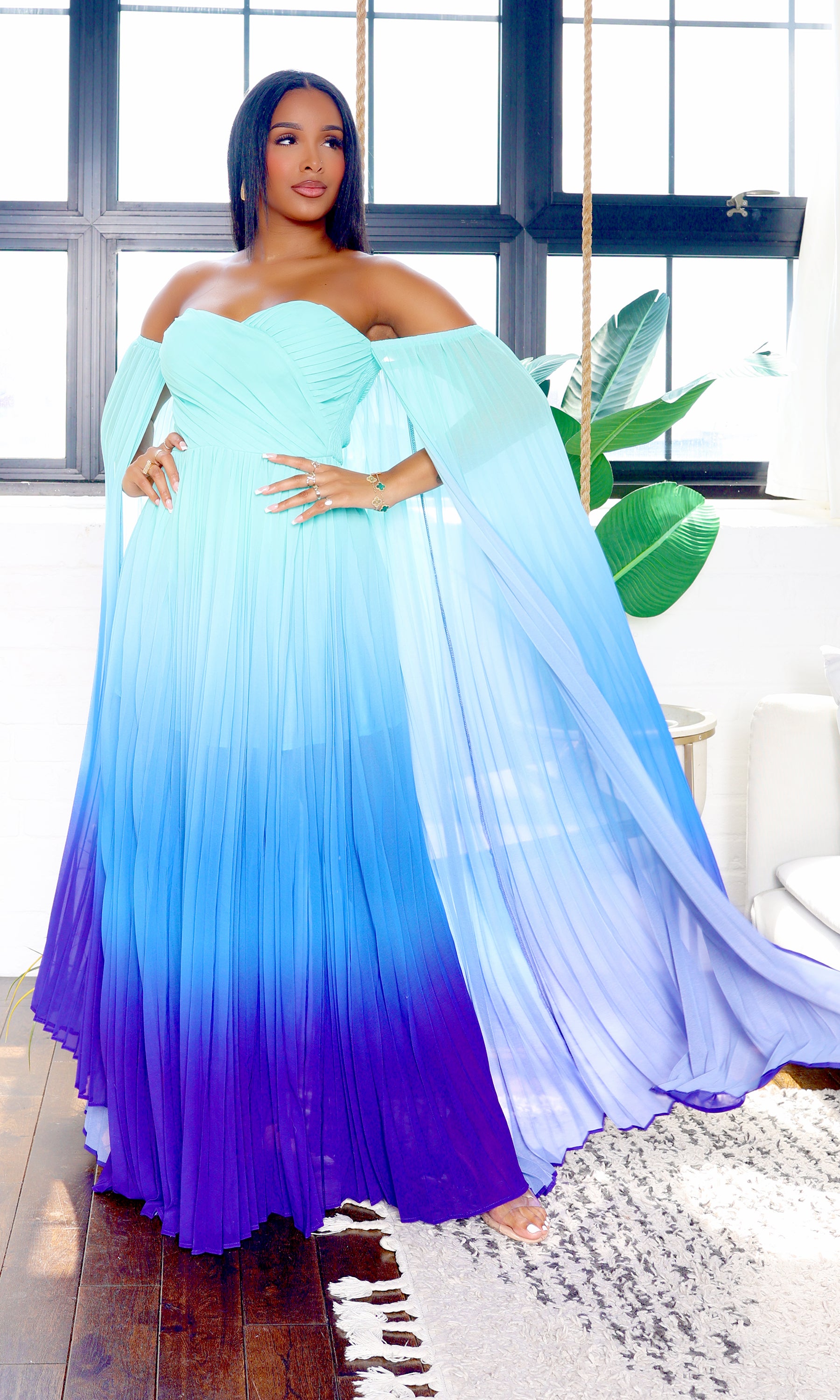 This stunning maxi dress features an off-shoulder neckline and a captivating ombre effect that transitions from deep teal to a lighter ocean hue. The graceful A-line silhouette and ethereal cape detail add sophistication and drama, while the central back zipper ensures a perfect fit.