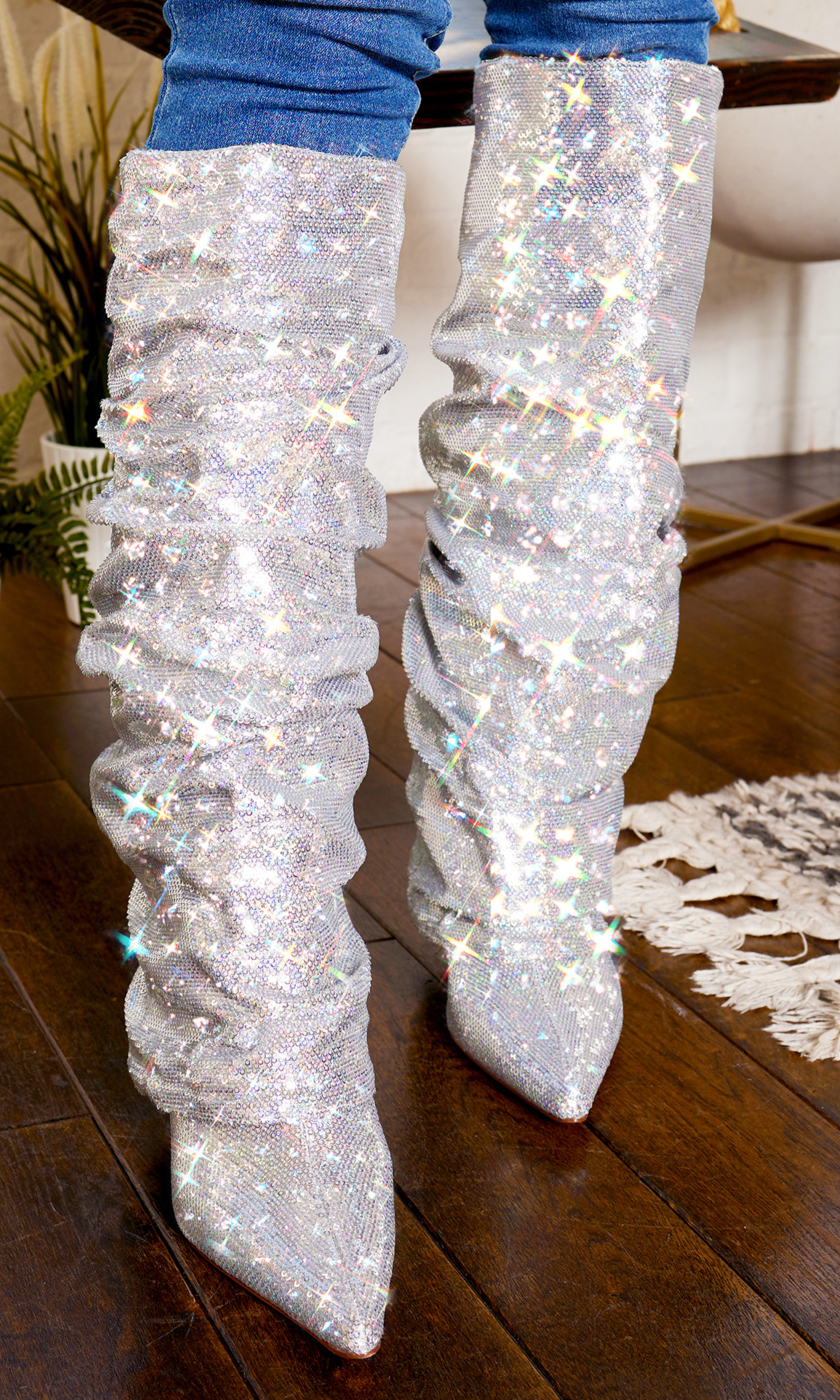 Sequins Point Toe Boots - Silver