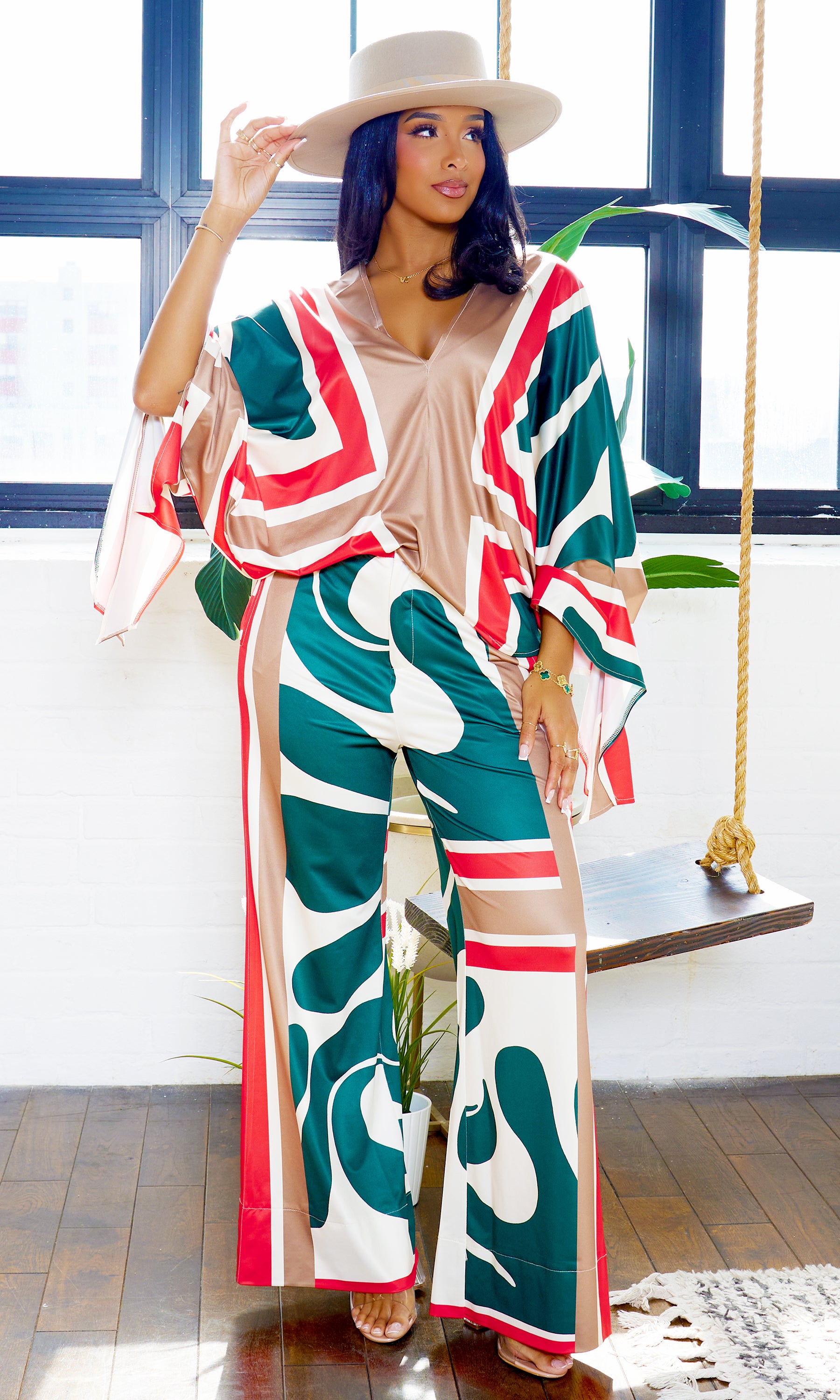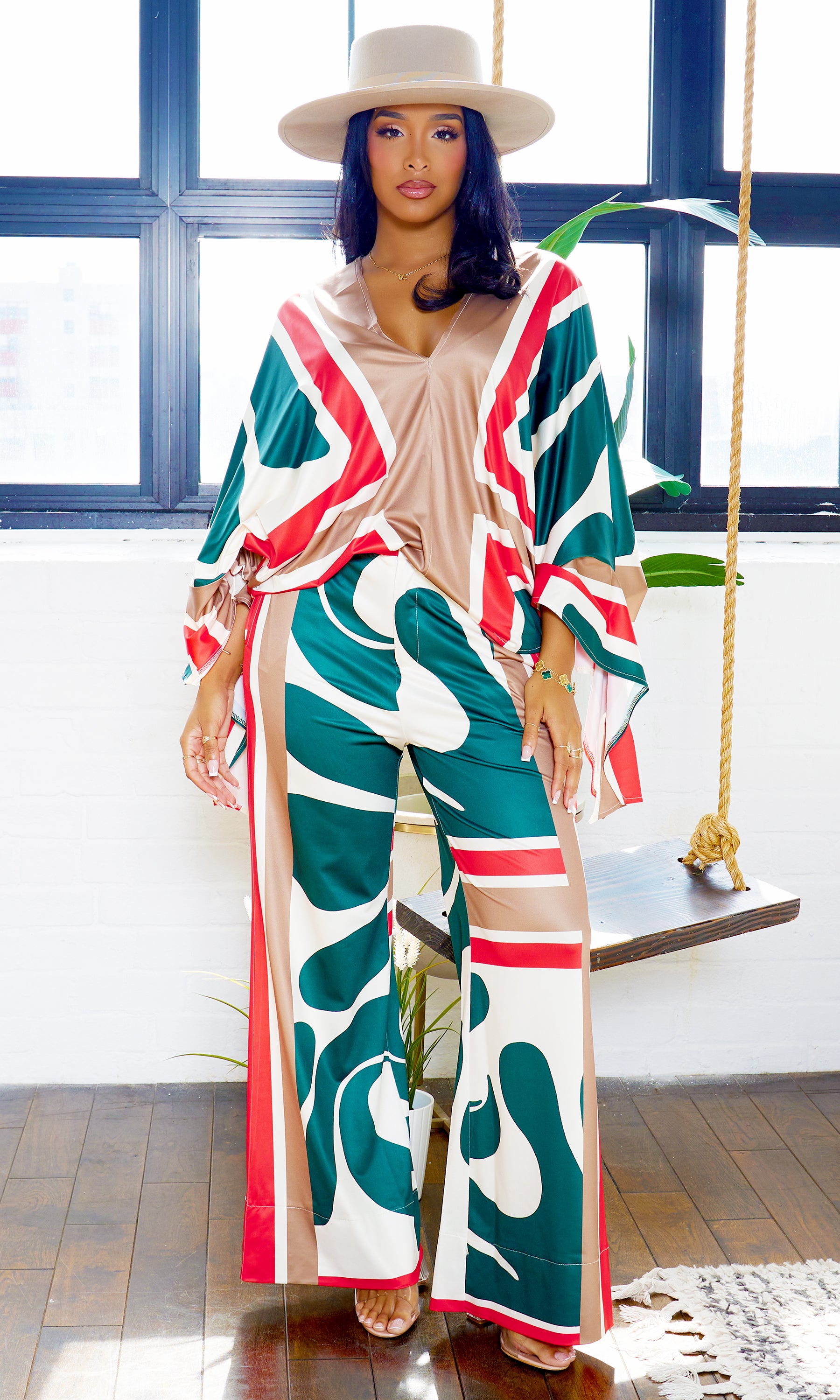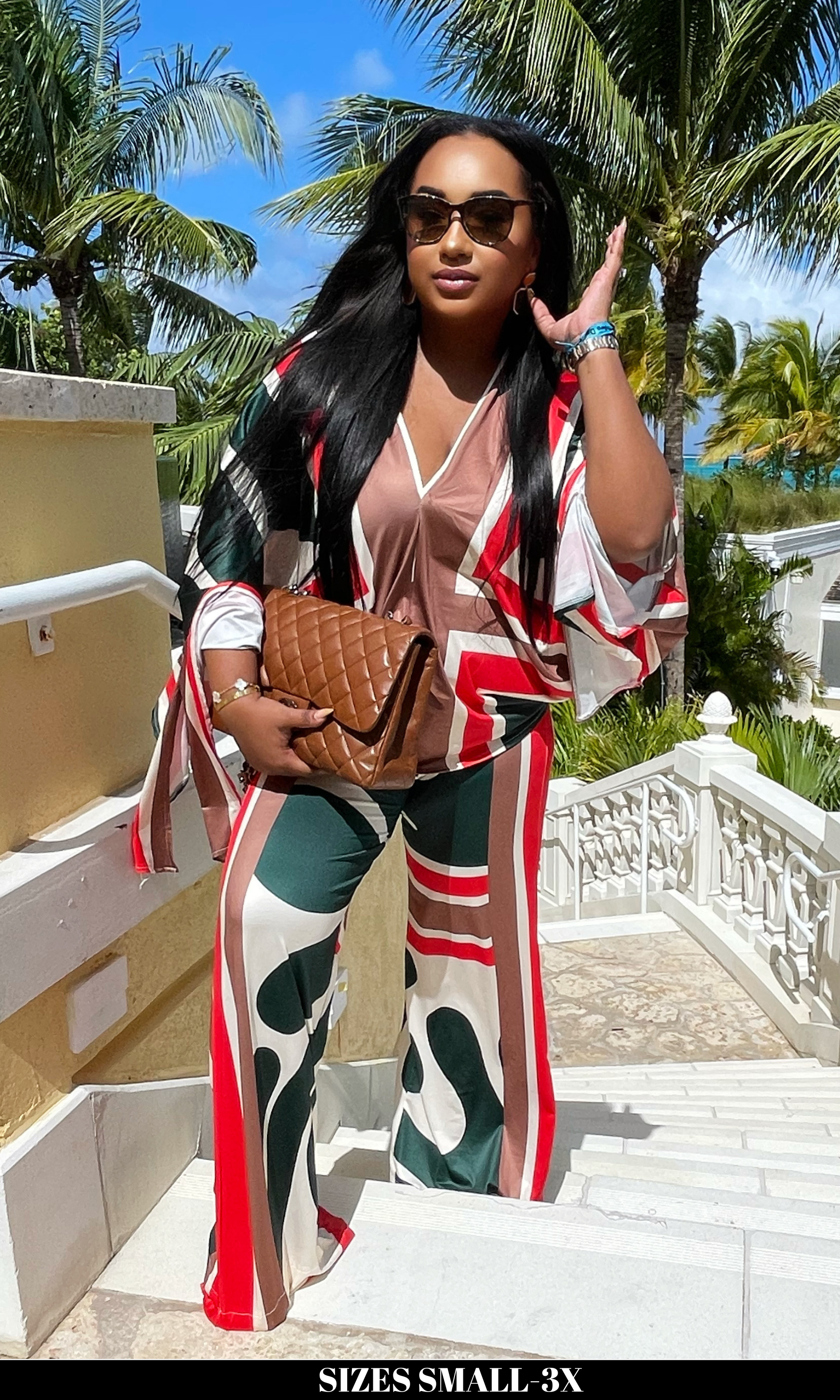 Grab you sunglasses, it's time to slay! We are loving this set! Features VERY stretchy, beautiful print fabric, V neckline, drama sleeves, matching long pants with elastic waistband for even more stretch.
