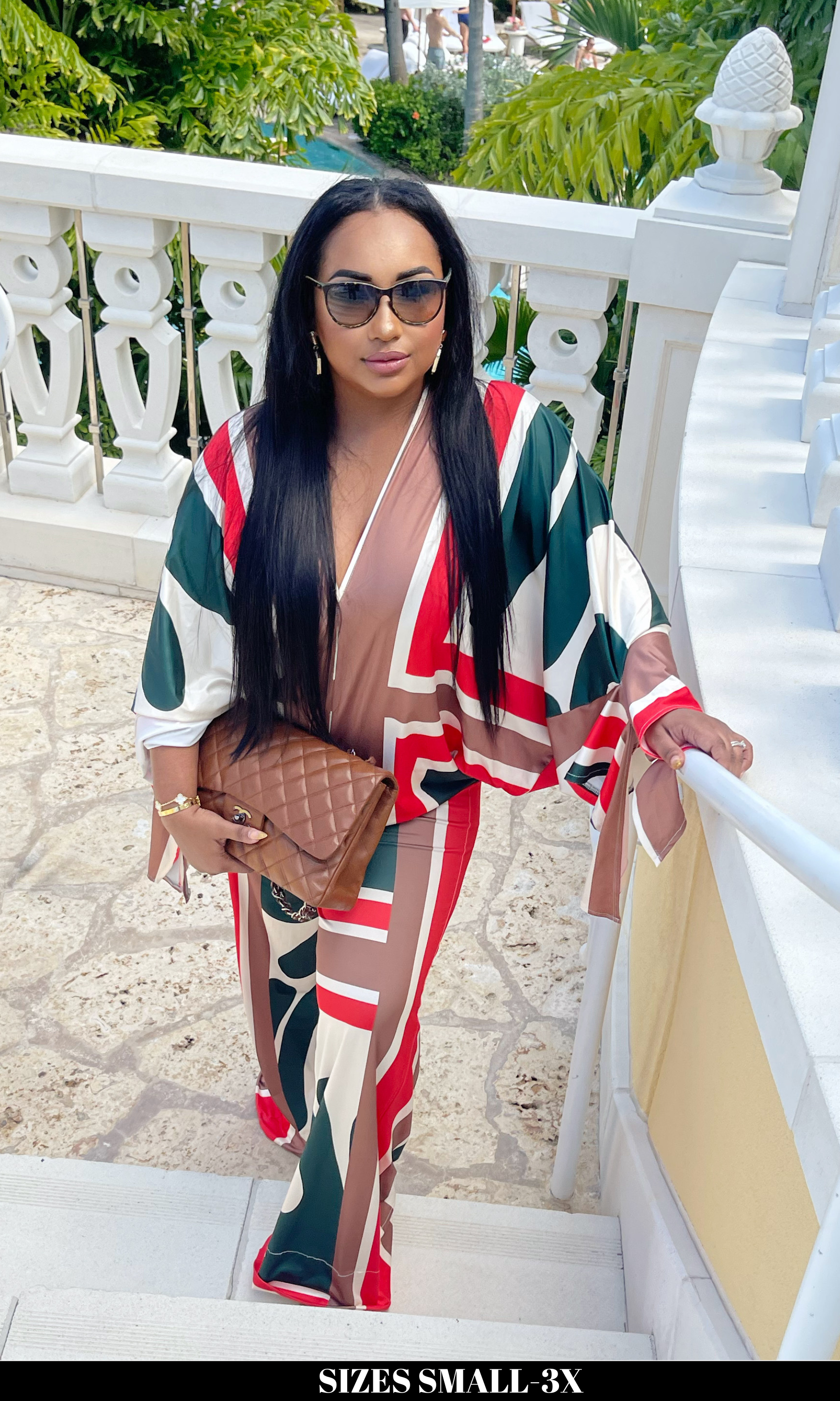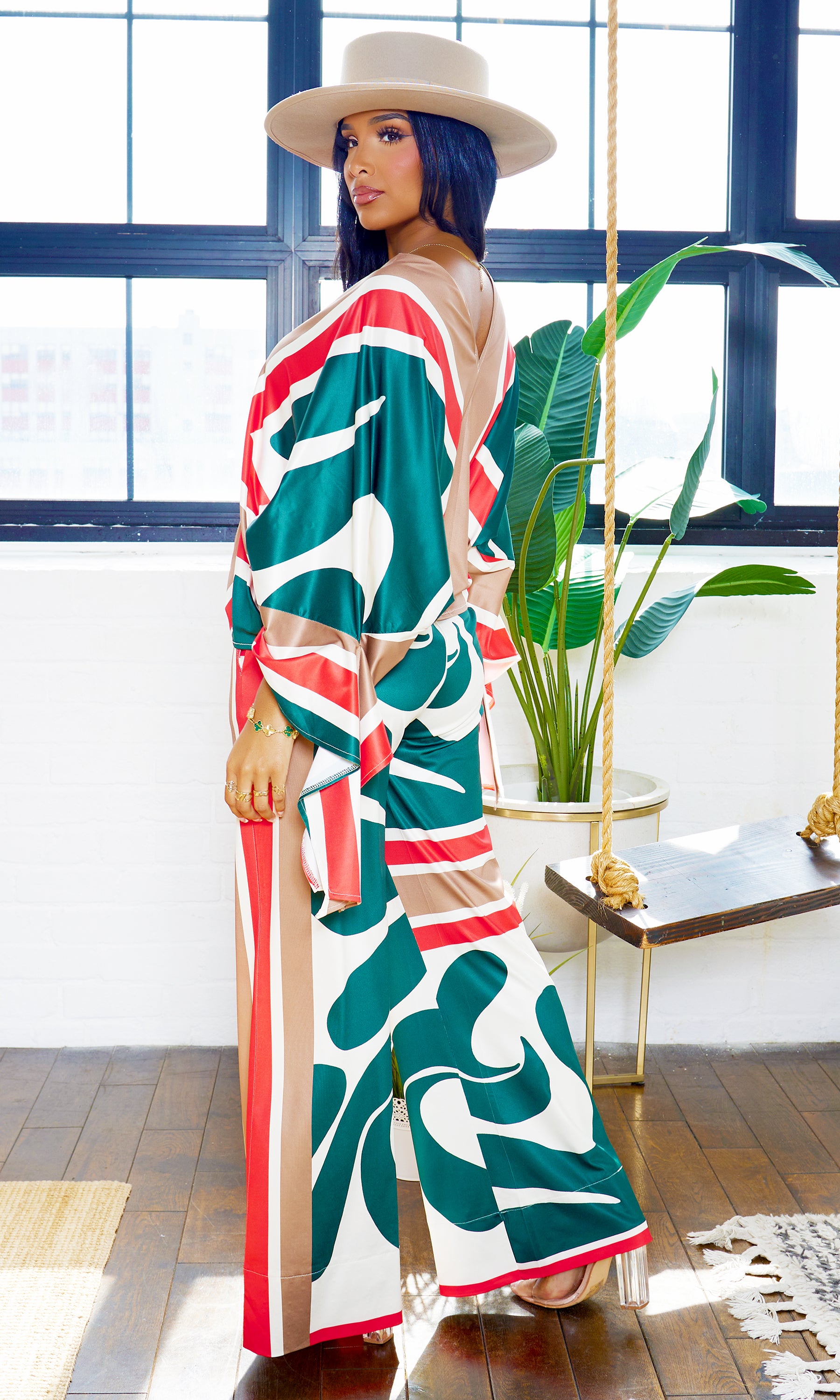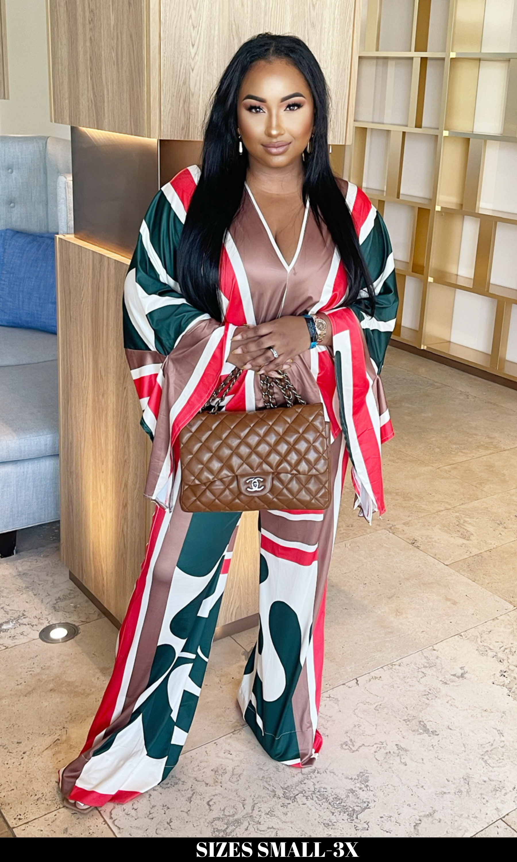 Grab you sunglasses, it's time to slay! We are loving this set! Features VERY stretchy, beautiful print fabric, V neckline, drama sleeves, matching long pants with elastic waistband for even more stretch.