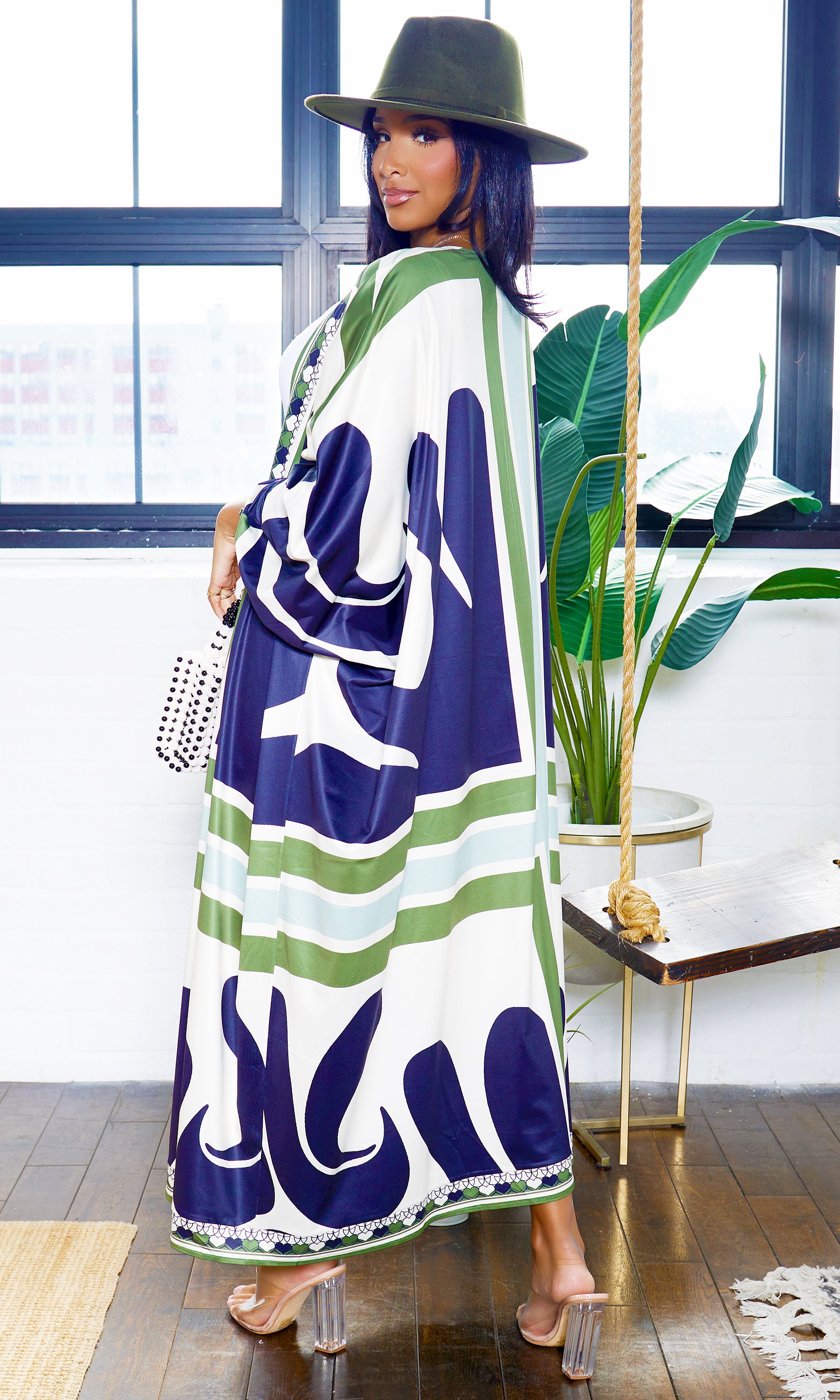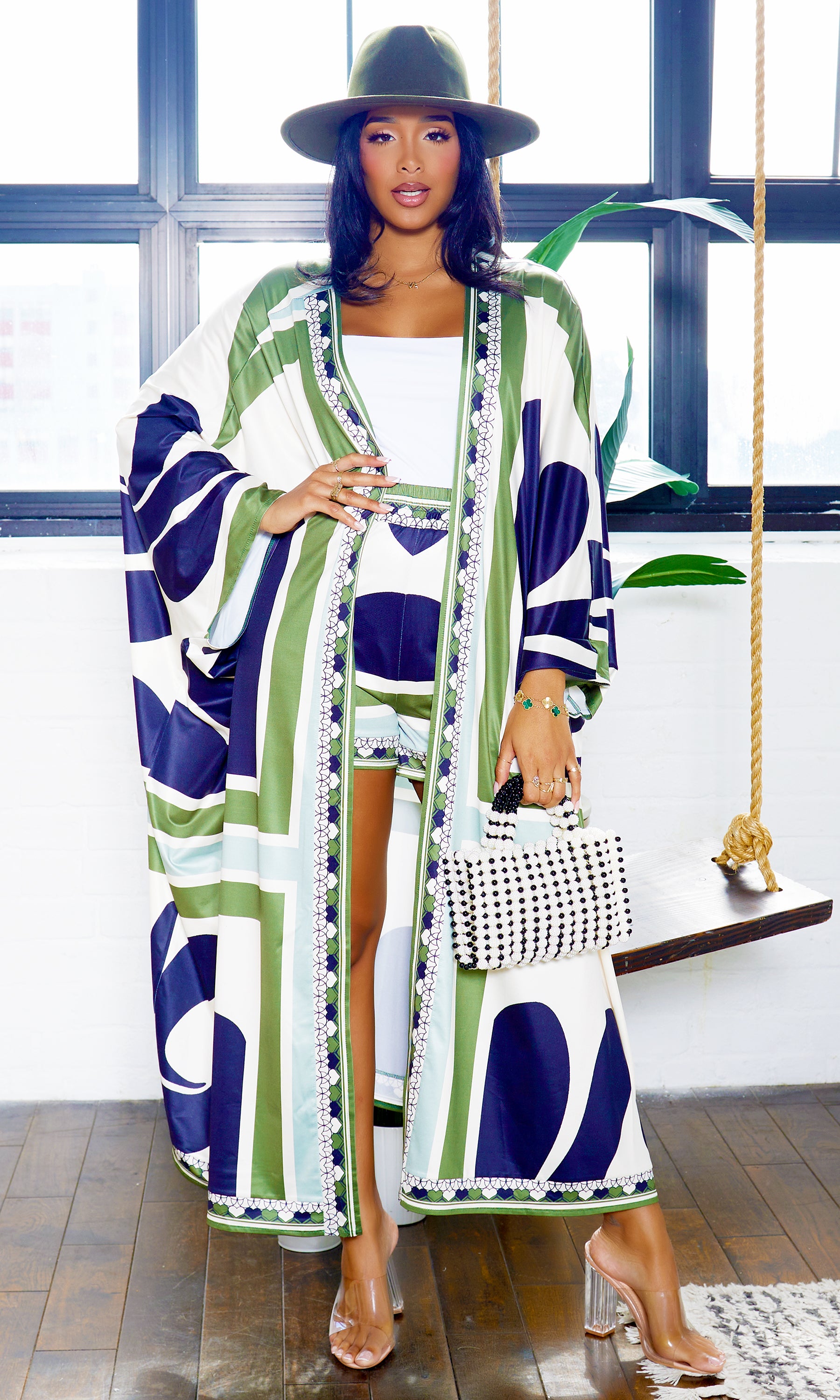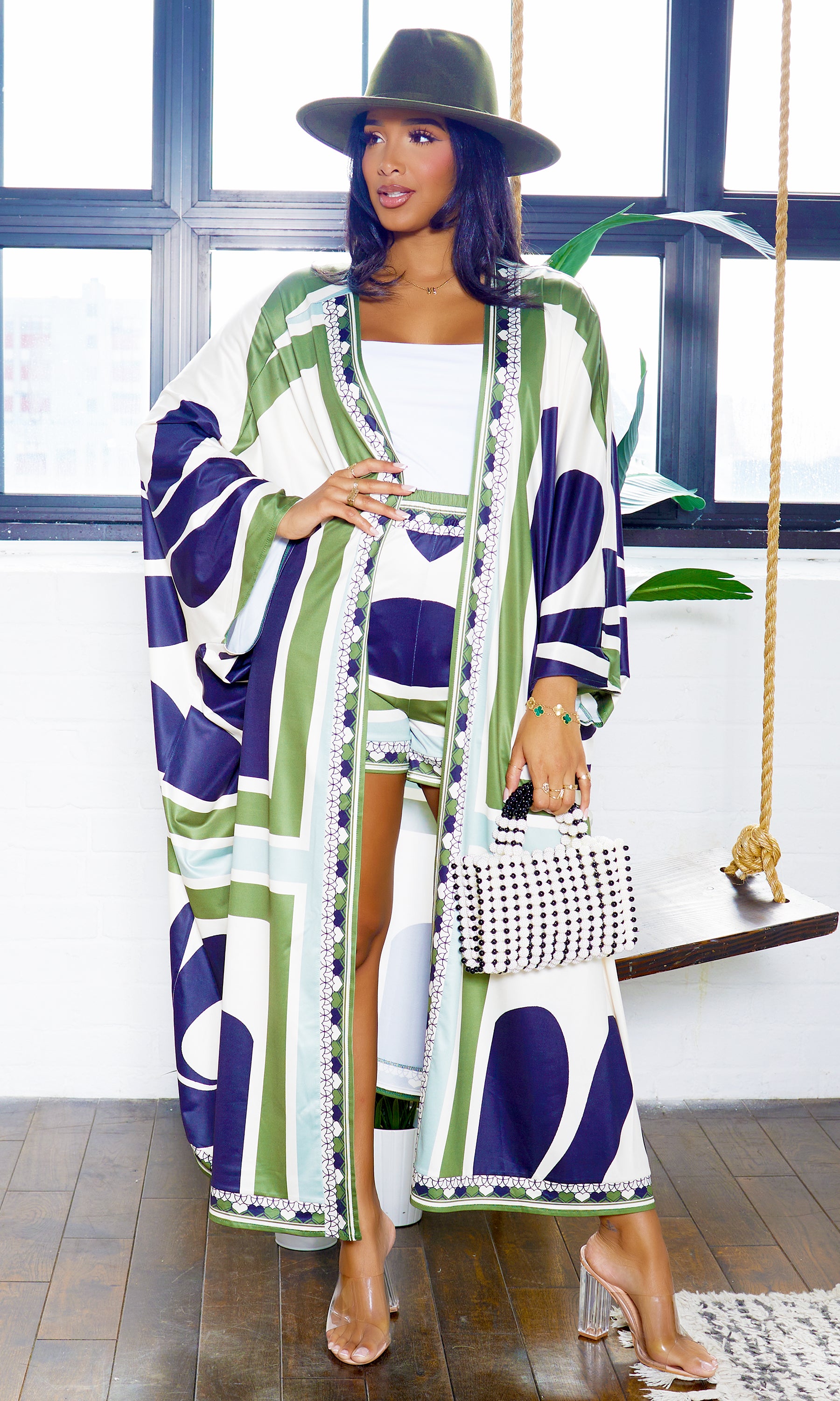 Grab you sunglasses, it's time to slay! We are loving this kimono set! Features long sleeve kimono and matching shorts. Great quality, so soft, great stretch. Complete your look with the Still Trending fedora (olive) as shown on the model!