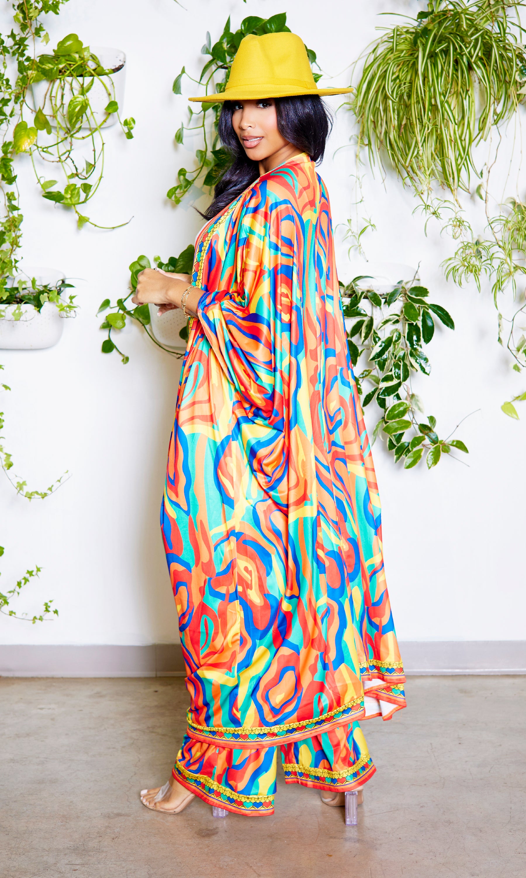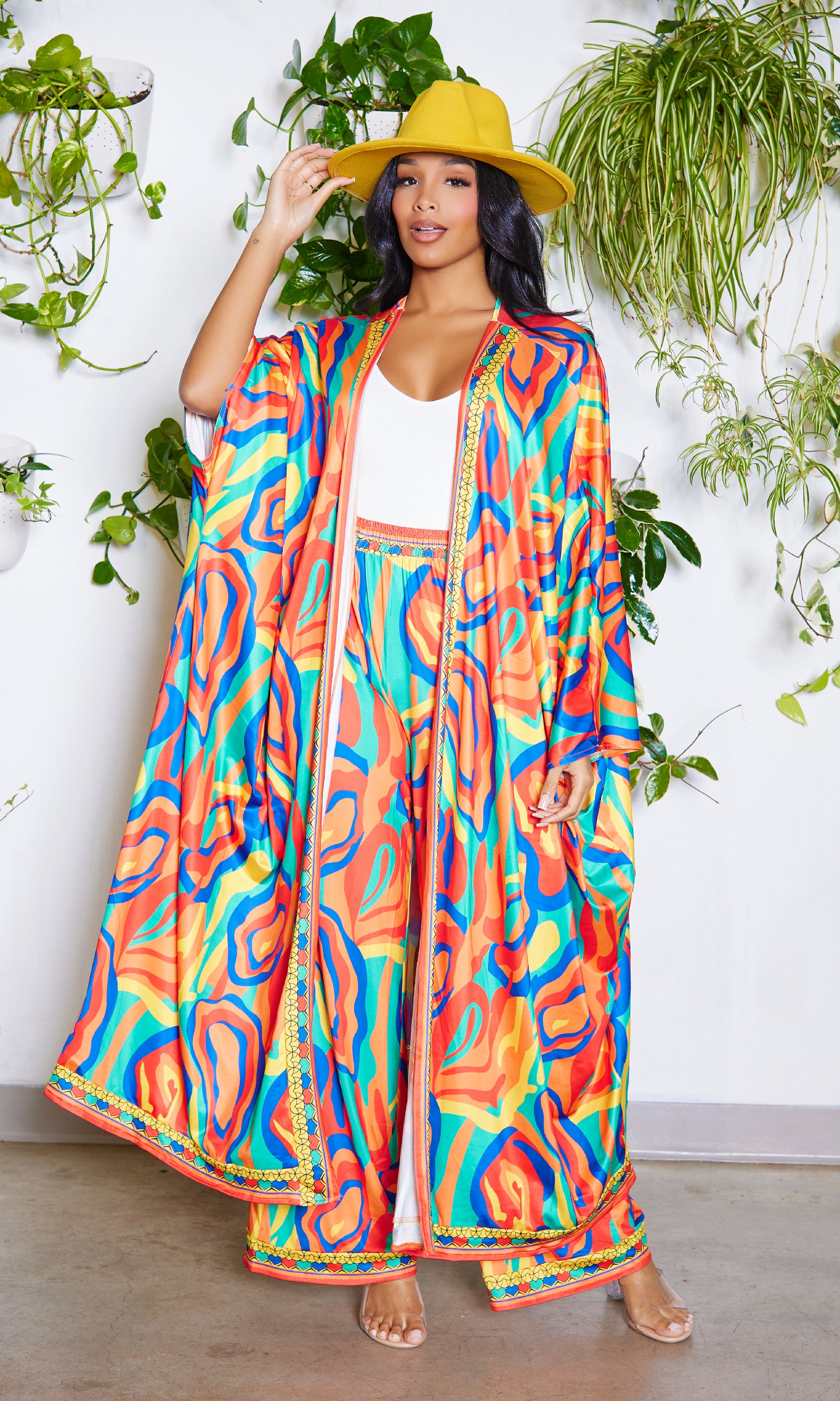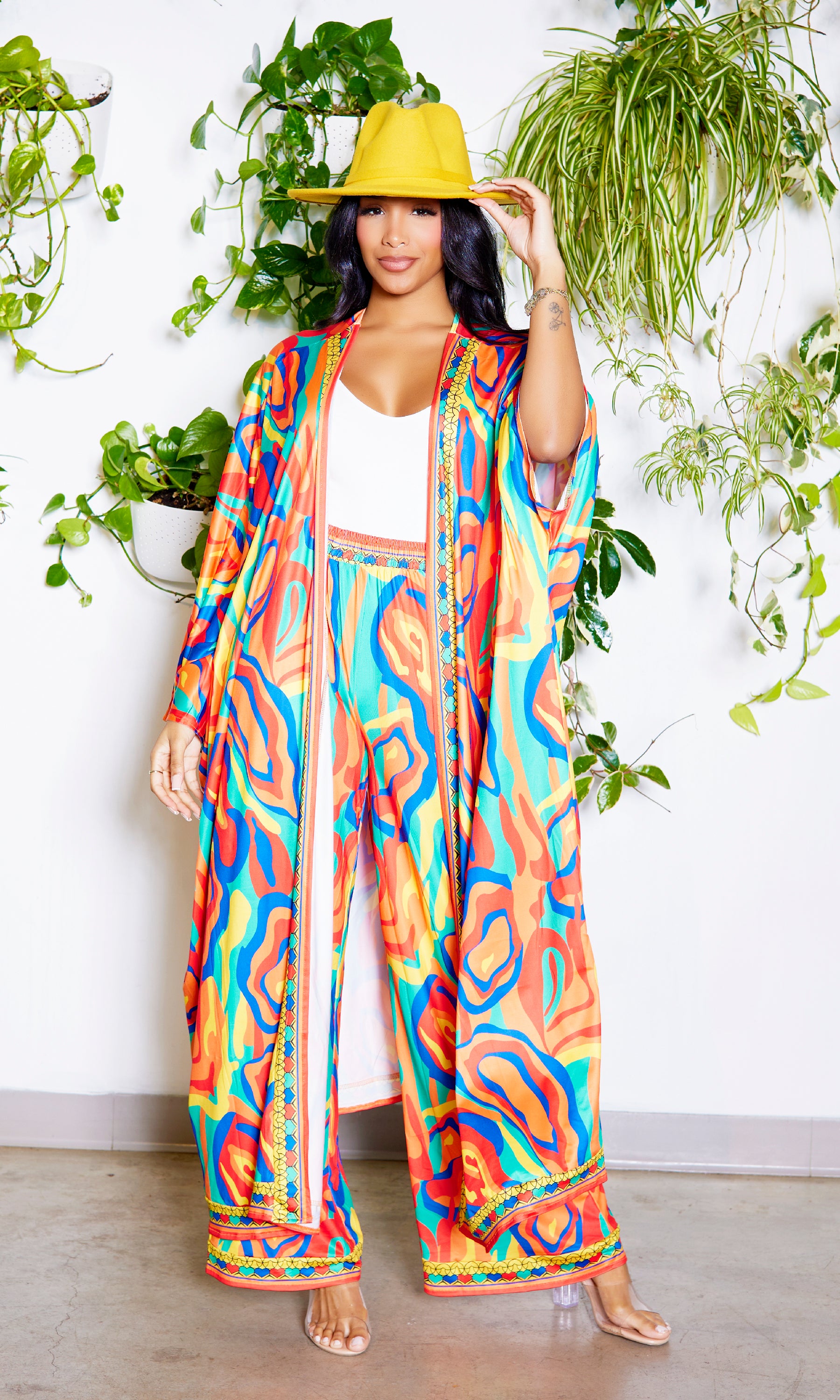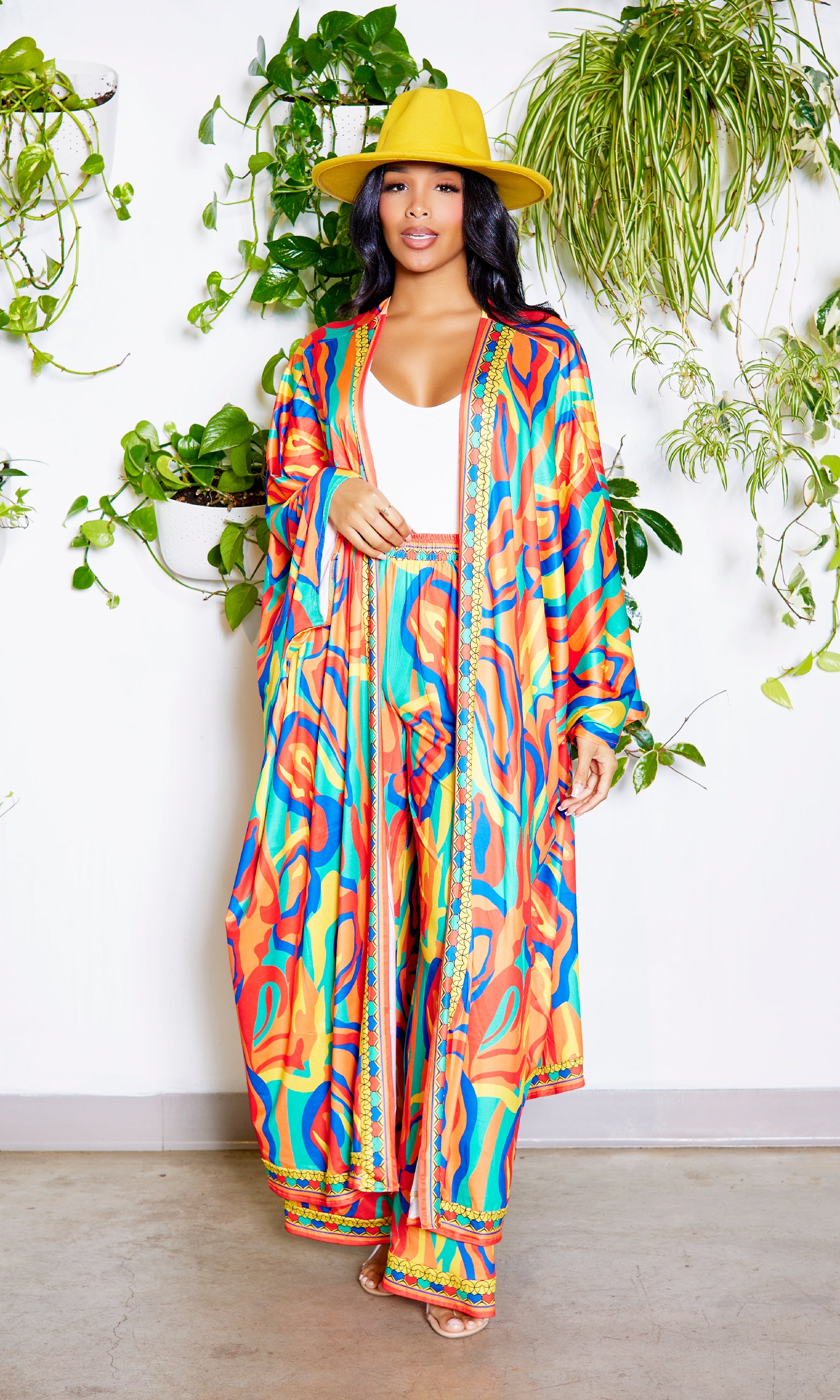 Grab you sunglasses, it's time to slay! We are loving this kimono set! Features long sleeve kimono and matching pants. Great quality, so soft, great stretch. Complete your look with the Still Trending fedora (Mustard) as shown on the model!