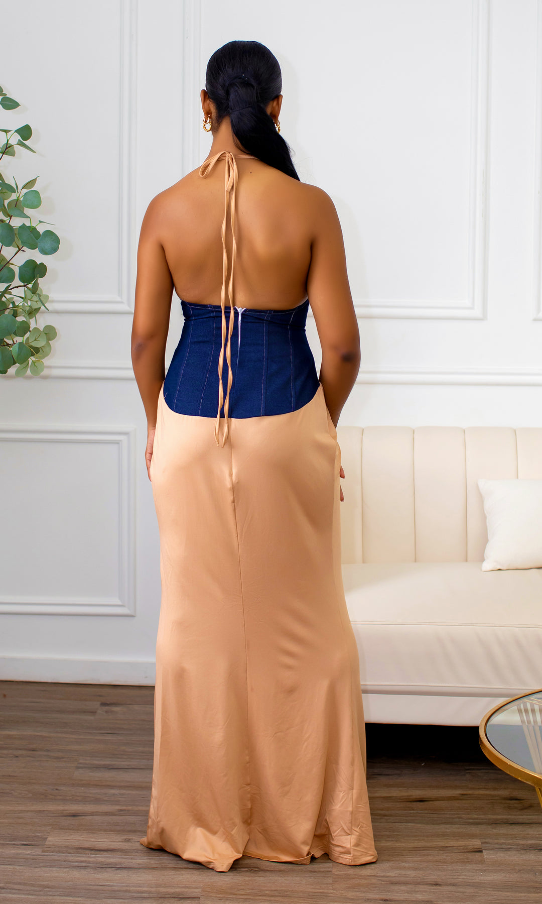 The Jovée Satin Maxi Dress is a flawless blend of sophistication and edge. Crafted in silky champagne satin with a striking denim corset waist, this gown is designed to flatter your figure while commanding attention. Featuring a deep halter neckline, flowing silhouette, and thigh-high slit, it’s the ultimate statement piece for elegant evenings and upscale events.