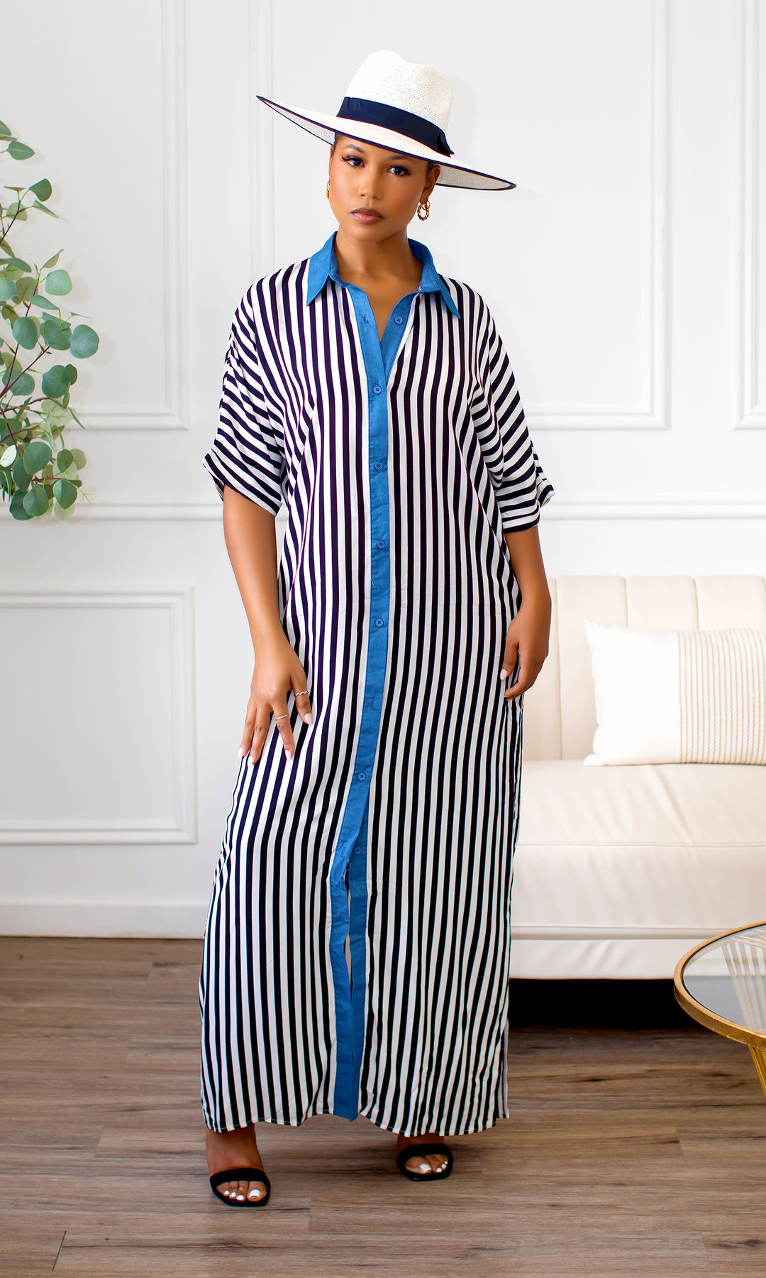 Who says timeless has to be tame? This black and white striped maxi shirt dress redefines classic with its bold vertical lines and an unexpected burst of cobalt blue at the collar and placket. With its effortless silhouette, wide sleeves, and breezy elegance, it asks: why choose between comfort and statement style when you can have both?