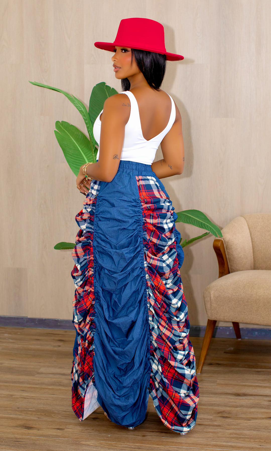 Bold and unconventional, the Denim Toggle Skirt fuses streetwear edge with playful sophistication. A ruched blue denim center, gathered with adjustable toggles, is flanked by contrasting plaid side panels that add texture and attitude. It’s a fearless statement piece that reimagines the classic skirt with a twist of drama and design.