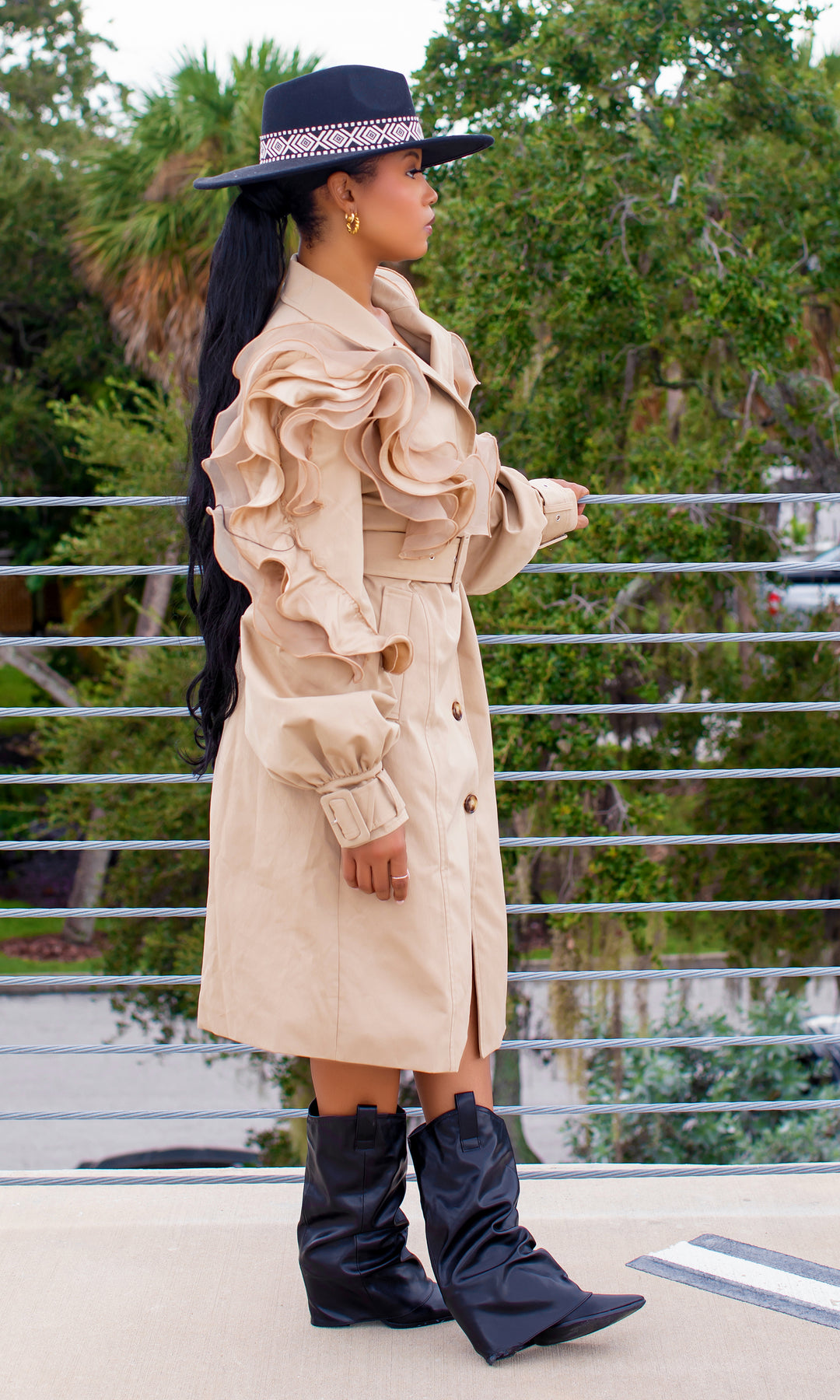 Step into bold sophistication with our Structured Luxe Trench. Designed with dramatic ruffle sleeves and a cinched belted waist, this trench coat transforms a classic silhouette into a statement piece. The structured fit and luxe detailing make it the ultimate blend of power and elegance, perfect for taking charge in style.