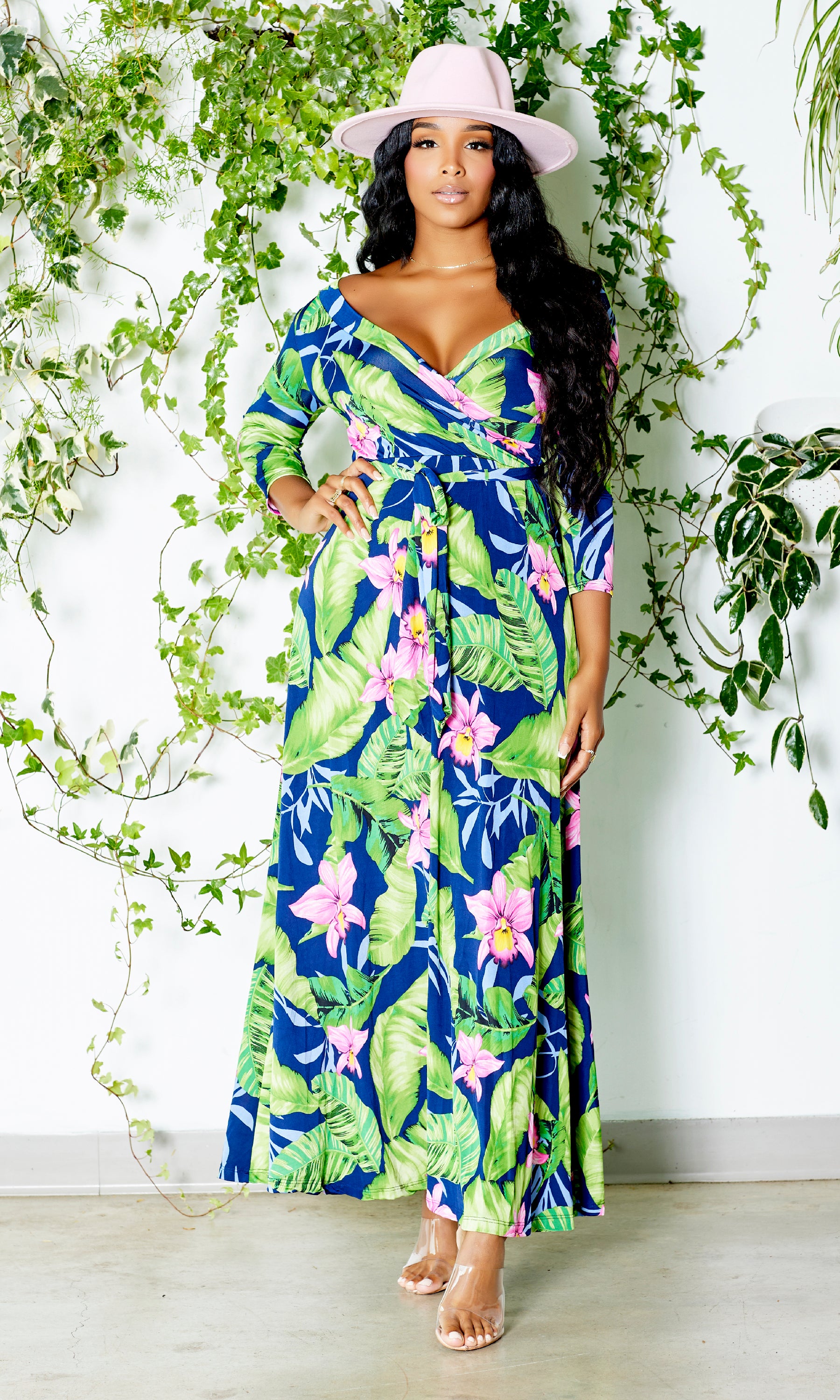 It's time to SLAY in this GORGEOUS pink lily palm printed dress. Can be worn on or off the shoulder. Great fit and stretch, nice flow and comfortable, this dress is a MUST.