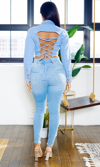 Model is wearing a small. Criss Cross Back Denim Jacket also available.