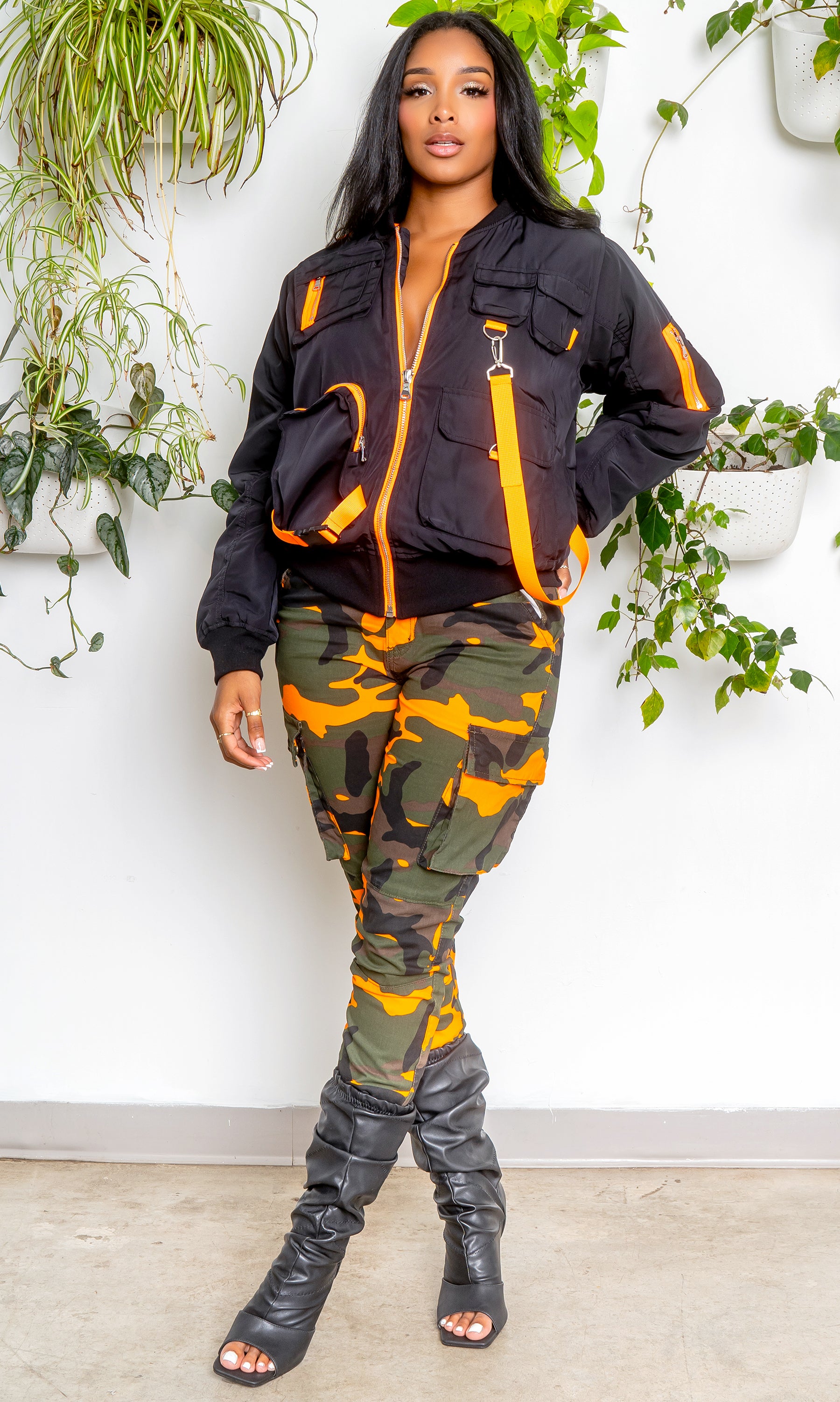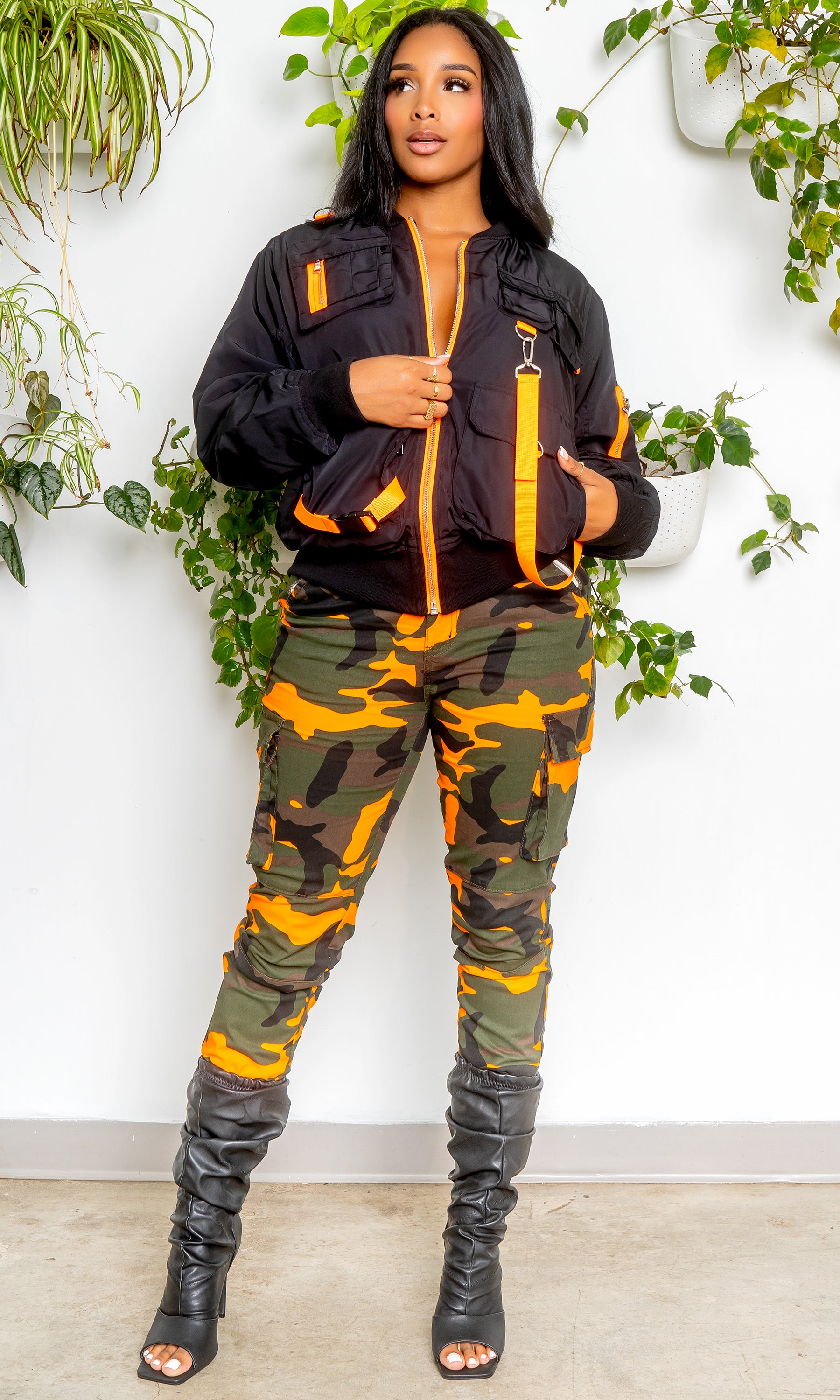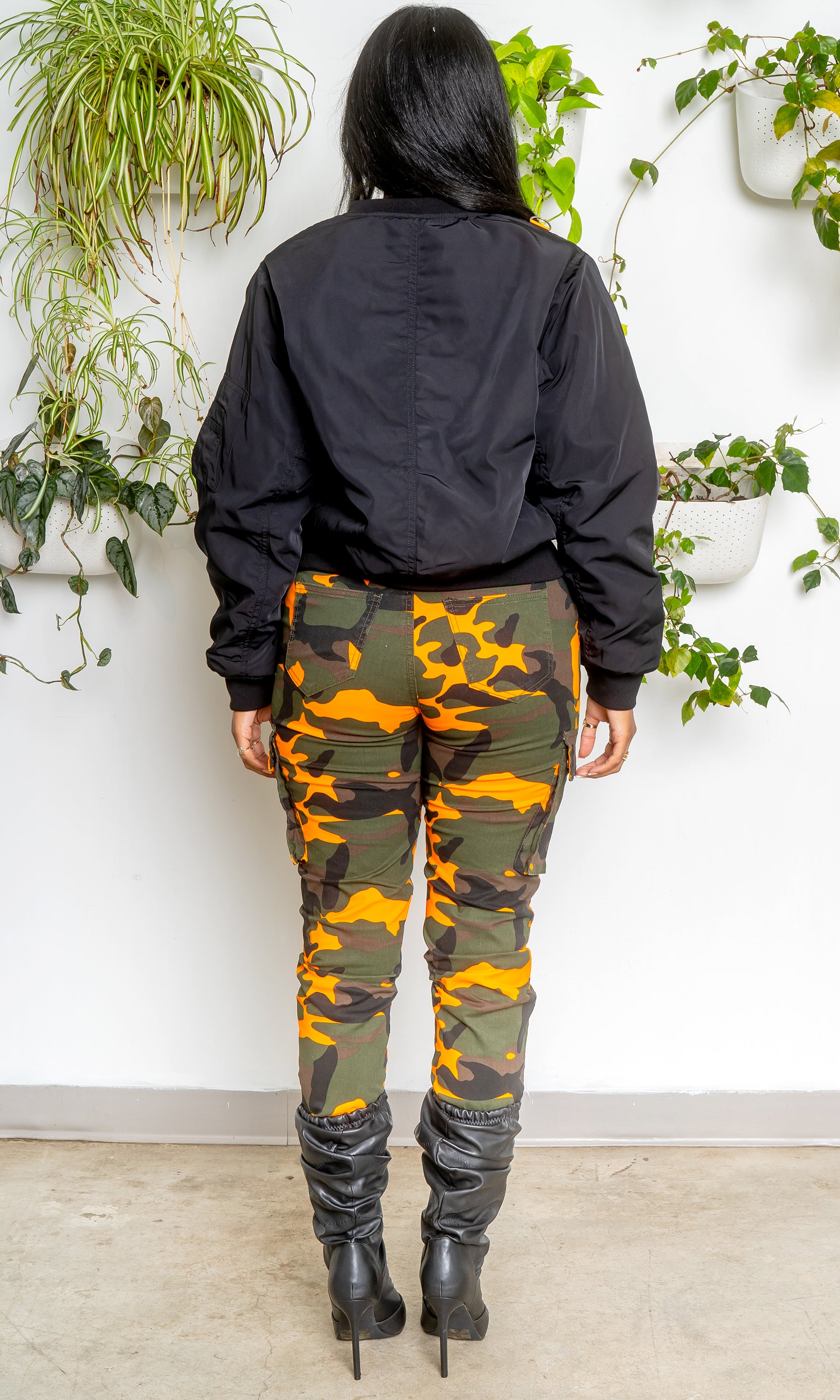Camo is a must this season! These camo cargo joggers feature a high rise, orange camo print, cargo pockets, and a jogger style. The jacket is sold separately.